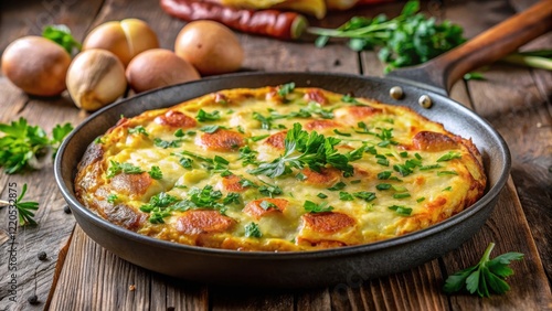 A crispy, golden-brown tortilla de patatas in a pan, with melted cheese and fresh herbs sprinkled on top, savory