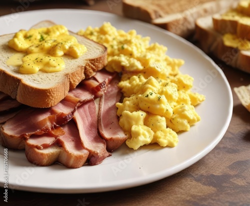 A crispy strip of bacon on a plate with scrambled eggs and toast, egg, eggs, food photography