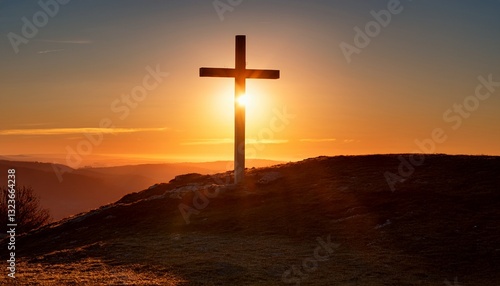 A cross on a hill, illuminated by the rising sun, symbolizing the Resurrection. The serene scene evokes hope, renewal, and the powerful message of faith and new beginnings.