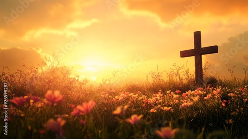 A cross stands tall against a vibrant sunrise, surrounded by a field of delicate wildflowers, symbolizing hope, faith, new beginnings, and spiritual awakening.
