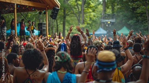 A crowd of people are dancing and singing at a festival. Scene is lively and energetic