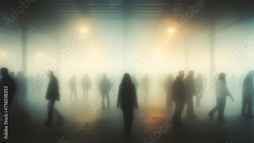 a crowd of people in blurry motion in the fog of a city street, abstract background, urban smoke, concept social issues