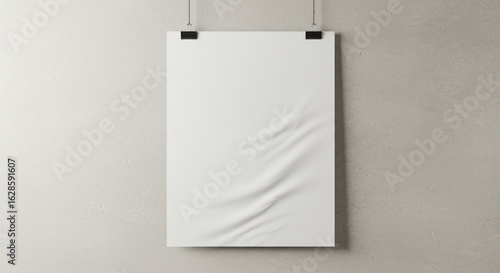 poster, paper, white, wall, background, texture, crumpled, creased, wrinkled, hanging, clip, template, design, blank, empty, surface, smooth, matte, vertical, format, presentation, display, advertisement, art, image, graphic, illustration, studio, photo, clean, minimal, simple, modern, elegant, neutral, beige, grey, light, shadow, indoor, room, space, flat, sheet, material, print, media