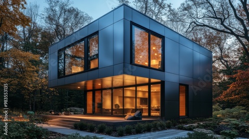 A cube-shaped house with metallic cladding, large square windows on two sides, and smaller windows for privacy on others, modern design, minimalistic garden