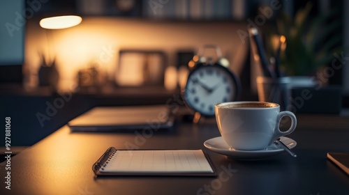 A Cup of Coffee and a Notebook on a Desk in a Cozy Office
