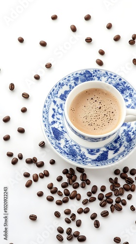 A cup of coffee and some coffee beans on the table, with a blue and white porcelain pattern and a dark brown bean spread around it