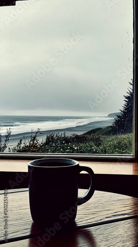 A cup of coffee on a table inside a house on the foggy, rainy Oregon coast, offering a view of the ocean and beach