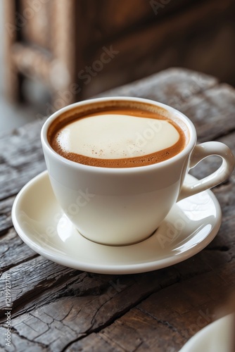 A cup of coffee on a wooden table, showcasing a creamy froth on top.