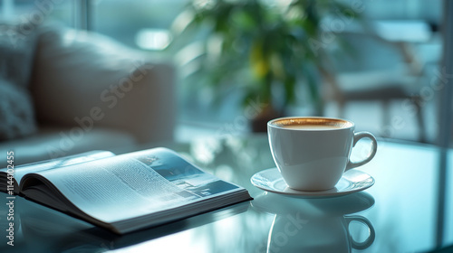 A cup of coffee sits on a glass table next to an open book. The scene is peaceful and inviting, bathed in soft, natural light.