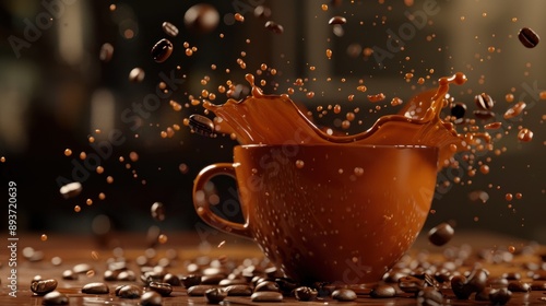 A cup of coffee with a splash of milk and coffee beans on a table