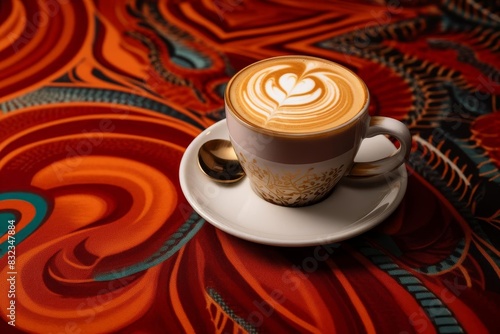 A cup of coffee with latte art in a stylish setting,