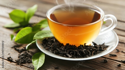 A cup of tea on a wooden table by a window, with steam rising.