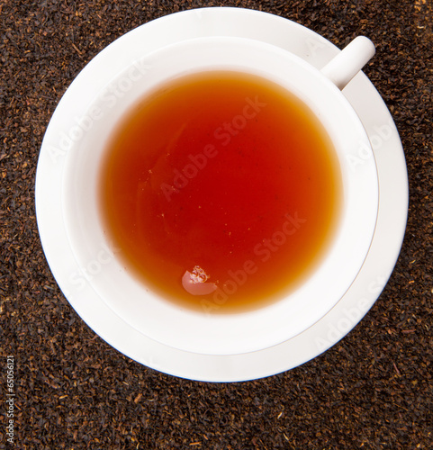 A cup of tea on dried and processed tea leaves
