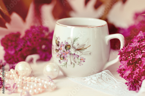 a cup of tea or coffee with a pattern in lilac bouquet of lilacs