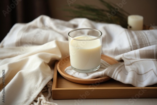 a cup of warm milk on a nightstand