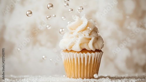 A cupcake styled as a bubbly champagne glass with sugar bubbles