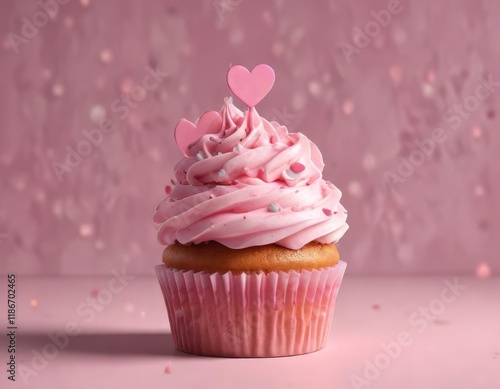 A cupcake with pink frosting and hearts on top, decorated, , dessert