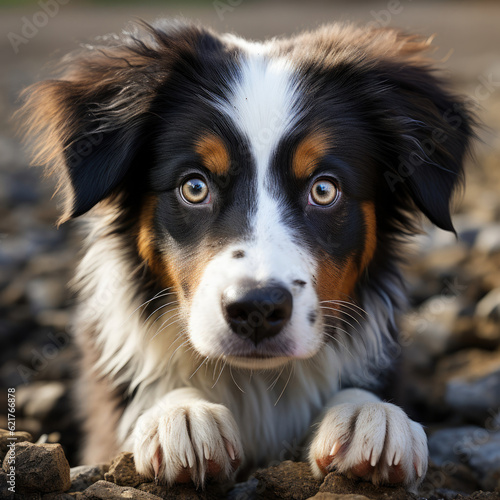 A curious Border Collie puppy (Canis lupus familiaris) with a red and white coat, exploring its surroundings.