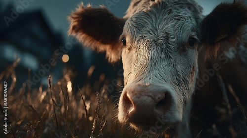 cow, cattle, animal, farm, farm animal, mammal, nature, rural, field, grass, agriculture, dairy, bovine, countryside, pasture, farming, domestic, portrait, face, head, closeup, brown, white, light, evening, dusk, sunset, peaceful, calm, farmland, meadow, scenic, wildlife, cute