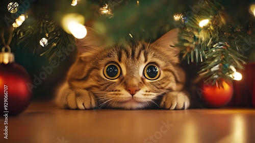 cat, christmas, tree, holiday, pet, kitten, animal, ornament, decoration, light, festive, cute, adorable, home, indoor, winter, december, felino, season, joy, magic, gift, surprise, paw, curious, playful, happy, family, celebration, love, red, green, yellow, brown, wood, floor, closeup, portrait