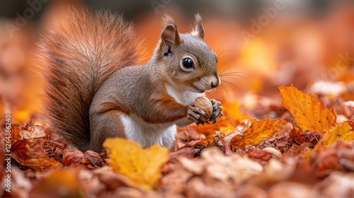 A curious squirrel holds a walnut amidst vibrant autumn leaves in a serene forest setting