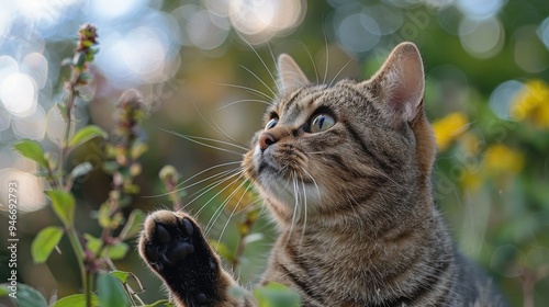 cat, tabby, garden, flower, curiosity, sunlight, playful, nature, animal, pet, exploring, paw, whisker, bright, colourful, foliage, greenery, beauty, felino, mischievous, closeup, vibrant, wildlife, seasonal, flora, cute, gaze, dynamic, inquisitive, lush, backyard, enchantment, serene, tranquil, afternoon