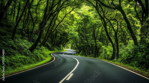 A curving road winds through a lush green forest with overhanging trees, creating a serene and inviting natural escape, perfect for a peaceful journey.