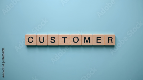 A customer spelt on wooden blocks placed on a blue surface. The word CUSTOMER is displayed in capital letters.
