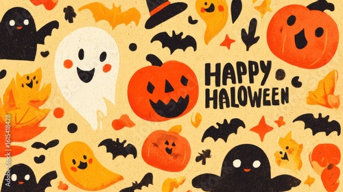 A cute and colorful illustration of various Halloween symbols like pumpkins, ghosts, bats, and smiling faces with the text "Happy Halloween". Orange color scheme, cute cartoon character design.
