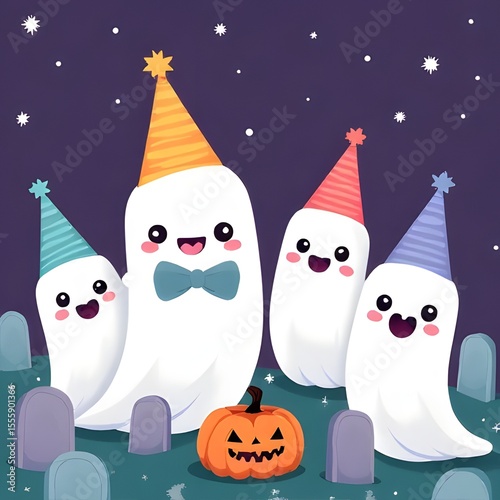 A cute and whimsical illustration of a group of friendly, rounded ghosts having a party in a minimalist graveyard. The ghosts, designed in a simple.
