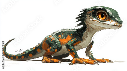 A cute baby Velociraptor sitting, vibrant green and orange accents, playful expression