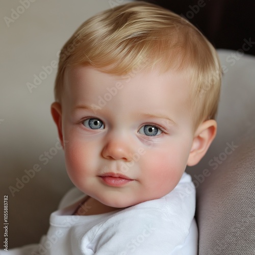 A cute baby with bright blue eyes and soft blonde hair, wearing a white shirt, showcasing the innocence of youth.