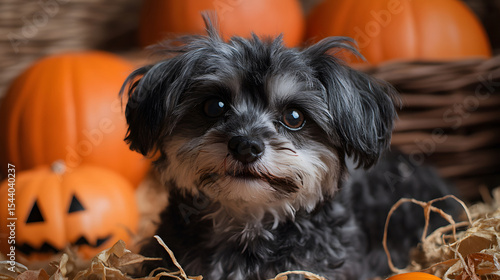 dog, pumpkin, halloween, pet, autumn, fall, cute, terrier, canino, animal, portrait, season, october, orange, holiday, festive, celebration, domestic, mammal, furry, breed, happy, face, eye, sweet, adorable, costume, basket, straw, harvest, decor, background, theme, seasonal, traditional, party