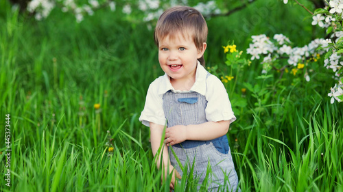 A cute boy with expressive blue eyes in a fashionable jumpsuit smiles funny and hides in the tall green grass