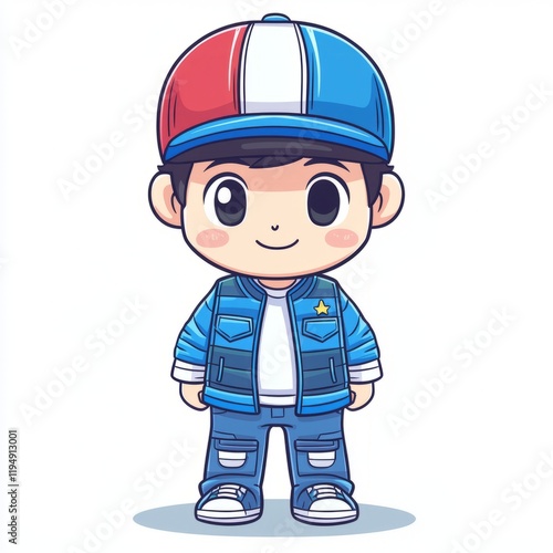 boy, cartoon, cute, children, children, apparel, clothing, hat, cap, blue, red, white, jacket, jean, pant, trousers, shoe, sneaker, happy, smiling, cheerful, friendly, adorable, young, small, little, fashion, style, trendy, casual attire, pocket, star, design, illustration, graphic, artwork, image, character, playful, vibrant, colours, drawing, toddler, kindergartner, innocent