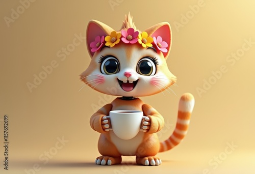 cute, cartoon, cat, kitten, animal, pet, flower, crown, hot drink, cup, drink, adorable, fluffy, happy, smile, cheerful, friendly, orange, white, brown, yellow, pink, illustration, digital artwork, three-dimensional, graphic, design, wallpaper, background