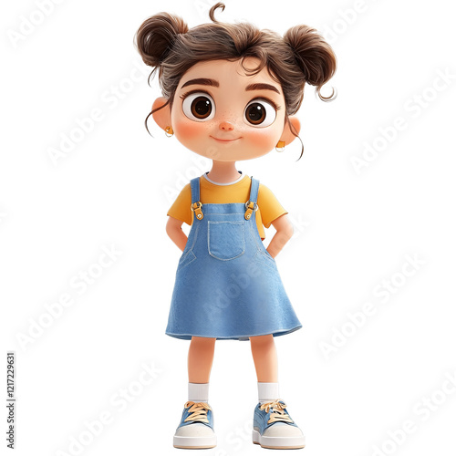 A cute cartoon character in a denim pinafore dress, paired with a t-shirt and sneakers, standing on a white background
