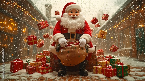 A cute cartoon of Santa Claus sitting on a chimney, surrounded by presents falling out of his sack, twinkling lights glowing on the roof, snow gently falling, bright holiday colors,