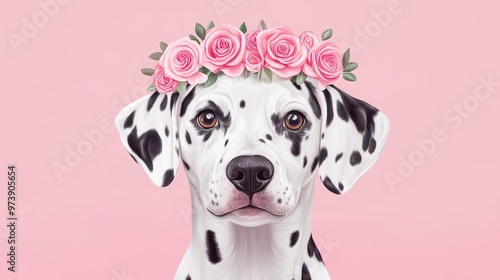 A cute Dalmatian with a floral crown against a soft pink backdrop, perfect for a Valentines Day tribute.
