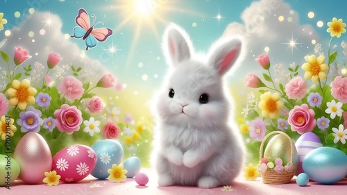 A cute, fluffy bunny in 3D, with soft, pastel colors. The background is a vibrant, springtime scene with blooming flowers, colorful Easter eggs, and a bright, sunny sky.