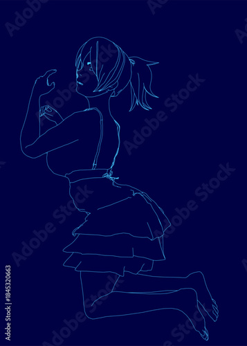 A cute girl in a dress strikes a peaceful pose with eyes closed. Her contour is sketched in blue on a matching background with a serene expression.