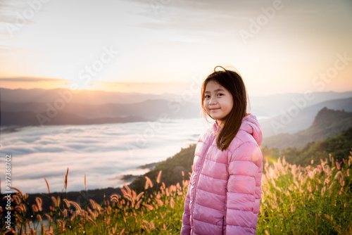 A Cute girl who is a tourist Wear a pink sweater Come up to see the beautiful mountain and sea mist. While looking at the sunrise