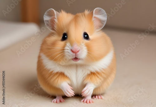 A cute golden hamster with large cheeks and a fluffy coat, sitting upright and looking directly at the camera