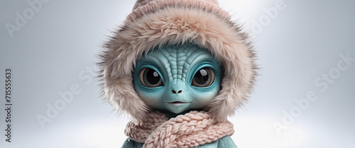 A cute green alien wearing a rich fur hat is looking straight ahead. Isolated on gray background. Monster illustration.