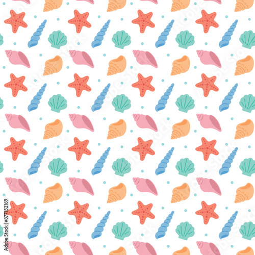 A cute hand-drawn summer sea concept patterned background illustration. Illustration of starfish, clams, coral, conch, horned conch, and conch.