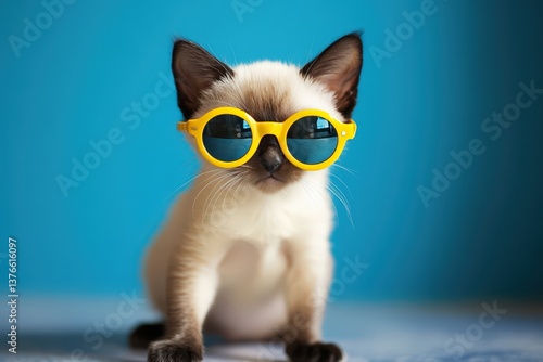 cat, kitten, sunglasses, eyewear, yellow, blue, background, adorable, small, cute, pet, animal, face, eye, fur, whisker, nose, ear, body, light, shadow, playful, resting, indoor, portrait, felino, domestic, sitting, looking, front, innocent, curious, sweet, chill, fashion, accessory, summer, round, cool, fun, style, close, up, tiny, young, pose, bright, focused