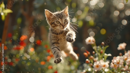 A cute kitten leaping into the air in a garden. Generative Ai