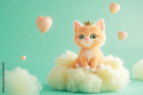 A cute kitten wearing a crown sits on a fluffy cloud, surrounded by heart-shaped balloons in a dreamy pastel setting.
