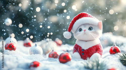 A cute kitten wearing a Santa hat and a red coat, surrounded by festive decorations and snow, creating a cheerful winter holiday atmosphere.