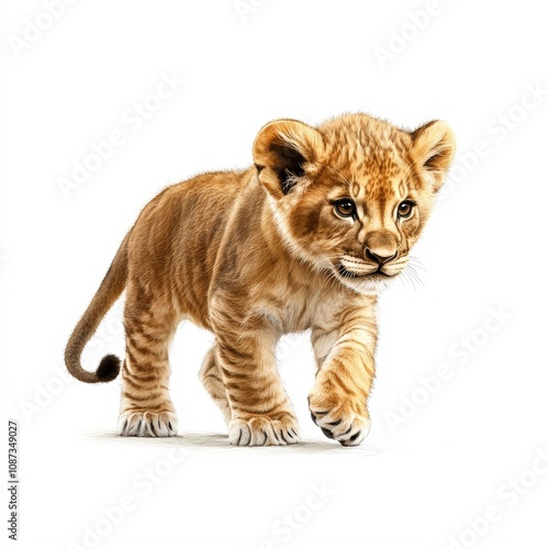 A cute lion cub walking with curiosity in a bright, white background, capturing the essence of wildlife and innocence.